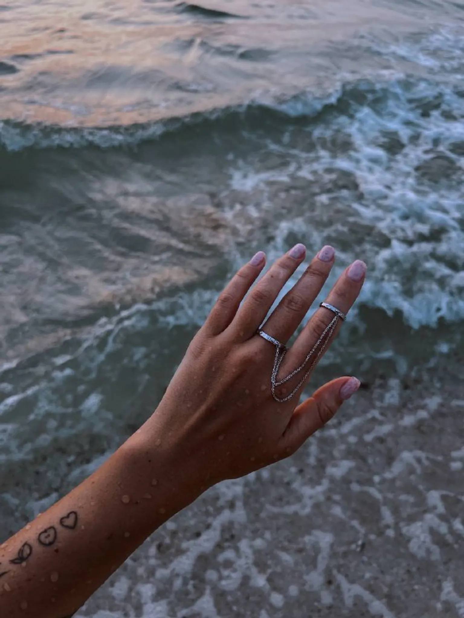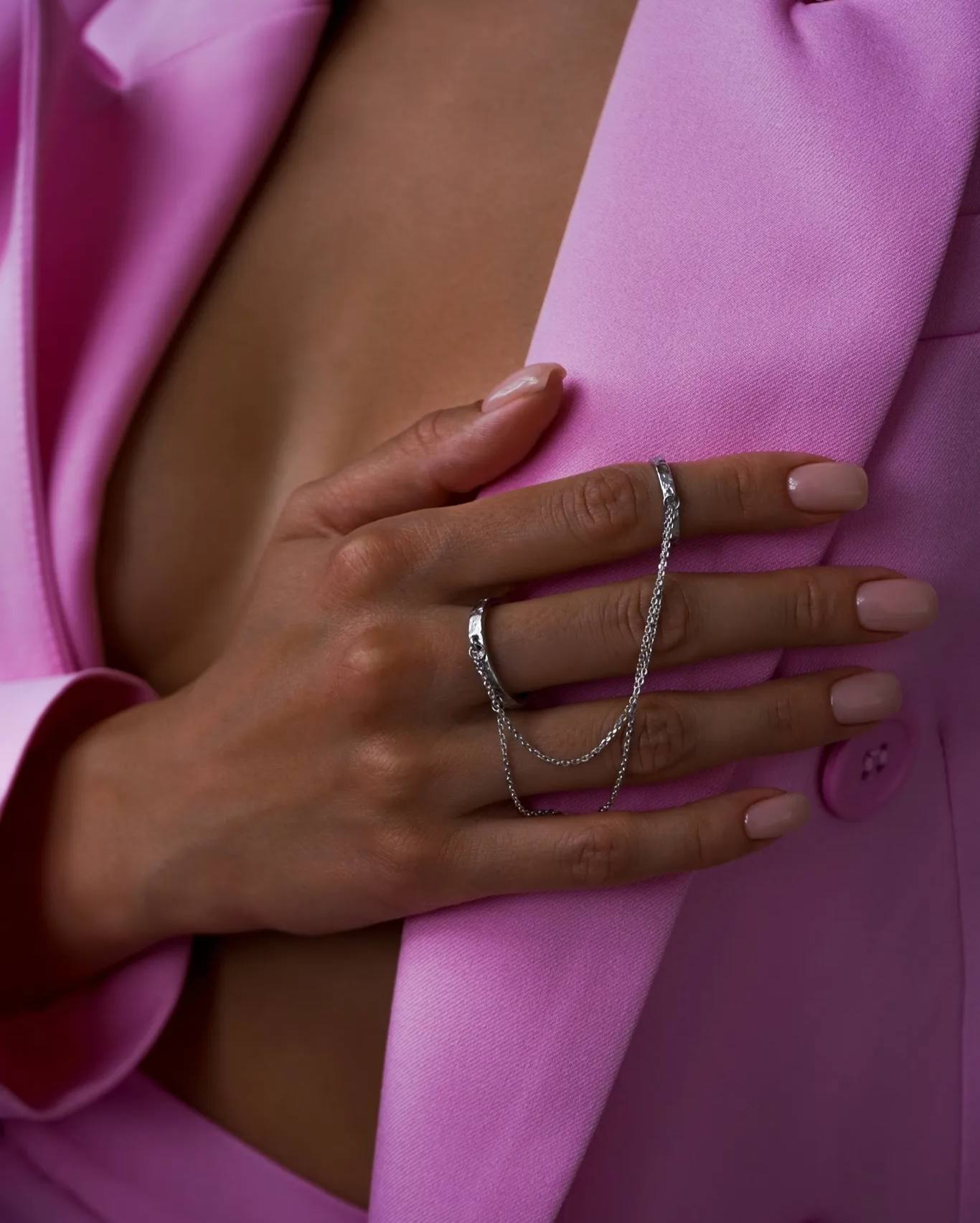 История этого украшения началась с колец на два пальца: в древности женщины дополняли такие кольца металлической пластиной и камнями, носили как обереги. В коллекциях SBLESKOM есть подобные украшения, правда вместо пластины серебряное двойное кольцо “Art” соединено лаконичными цепочками.