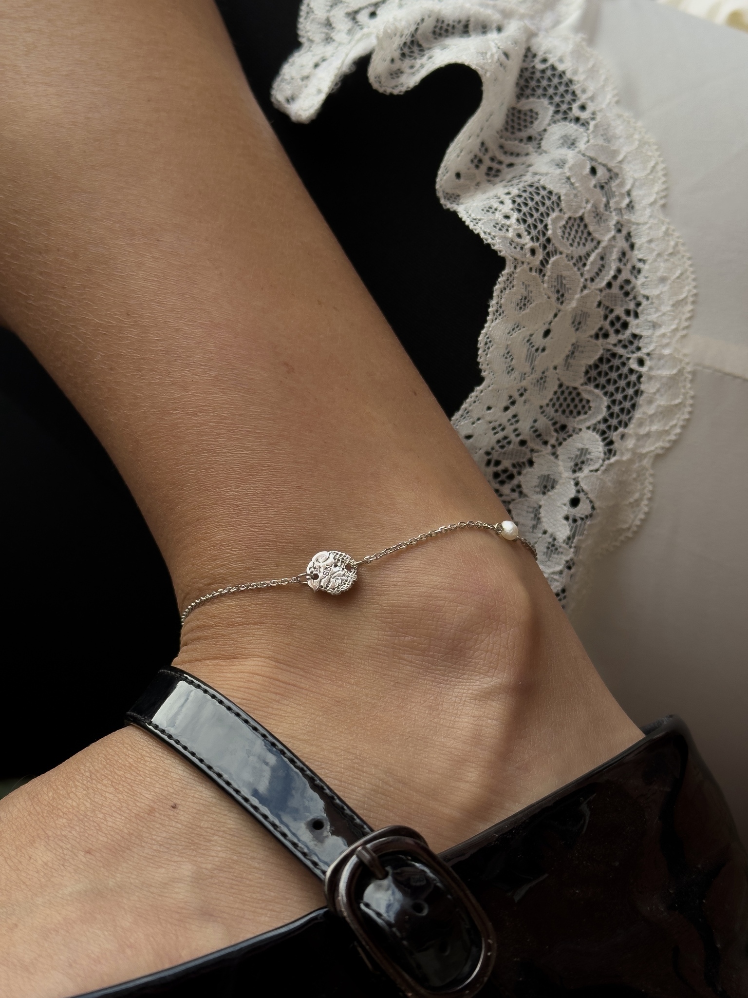 Серебряный браслет на цепочке на ногу «Кружево» с культивированным жемчугом